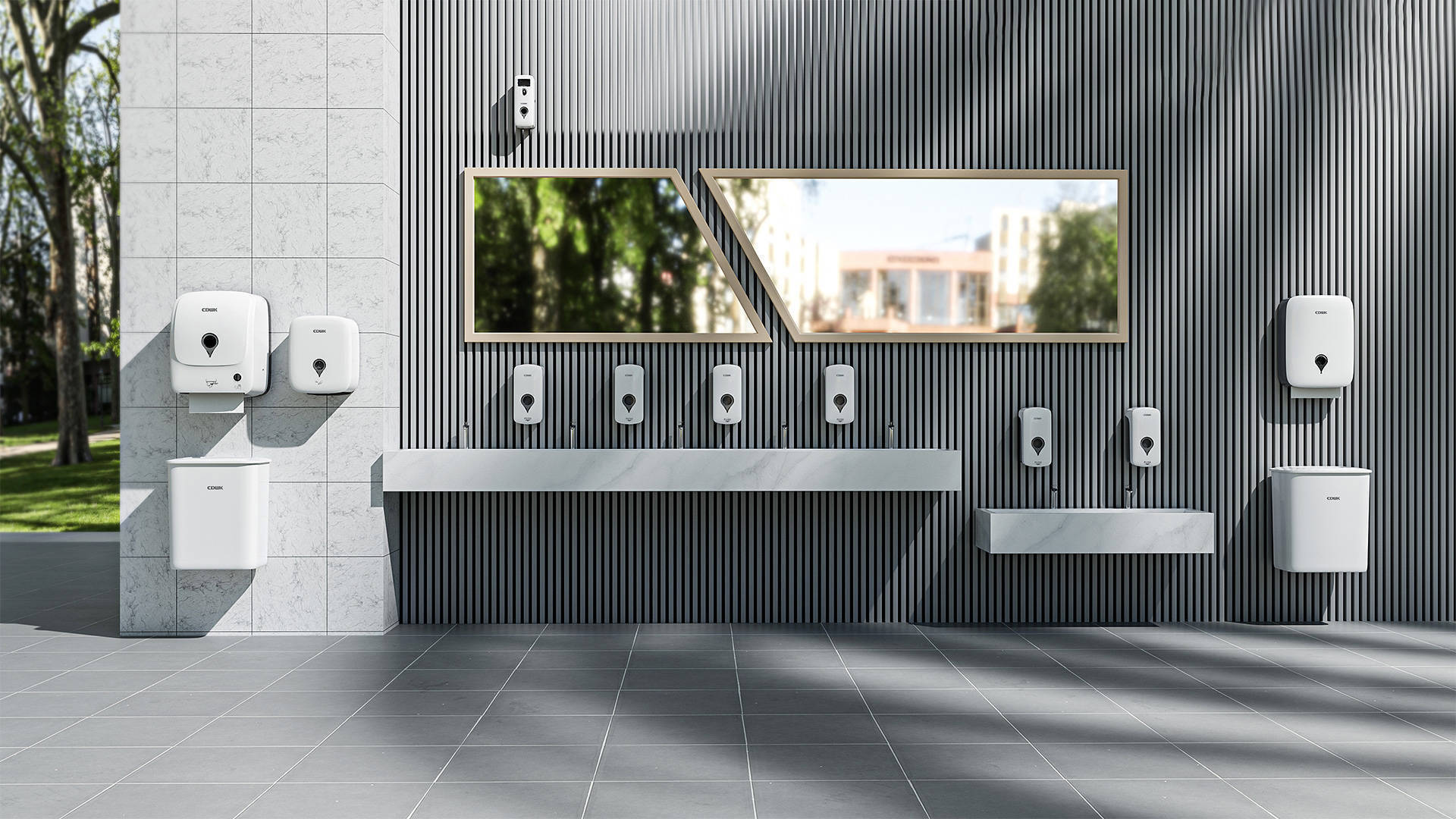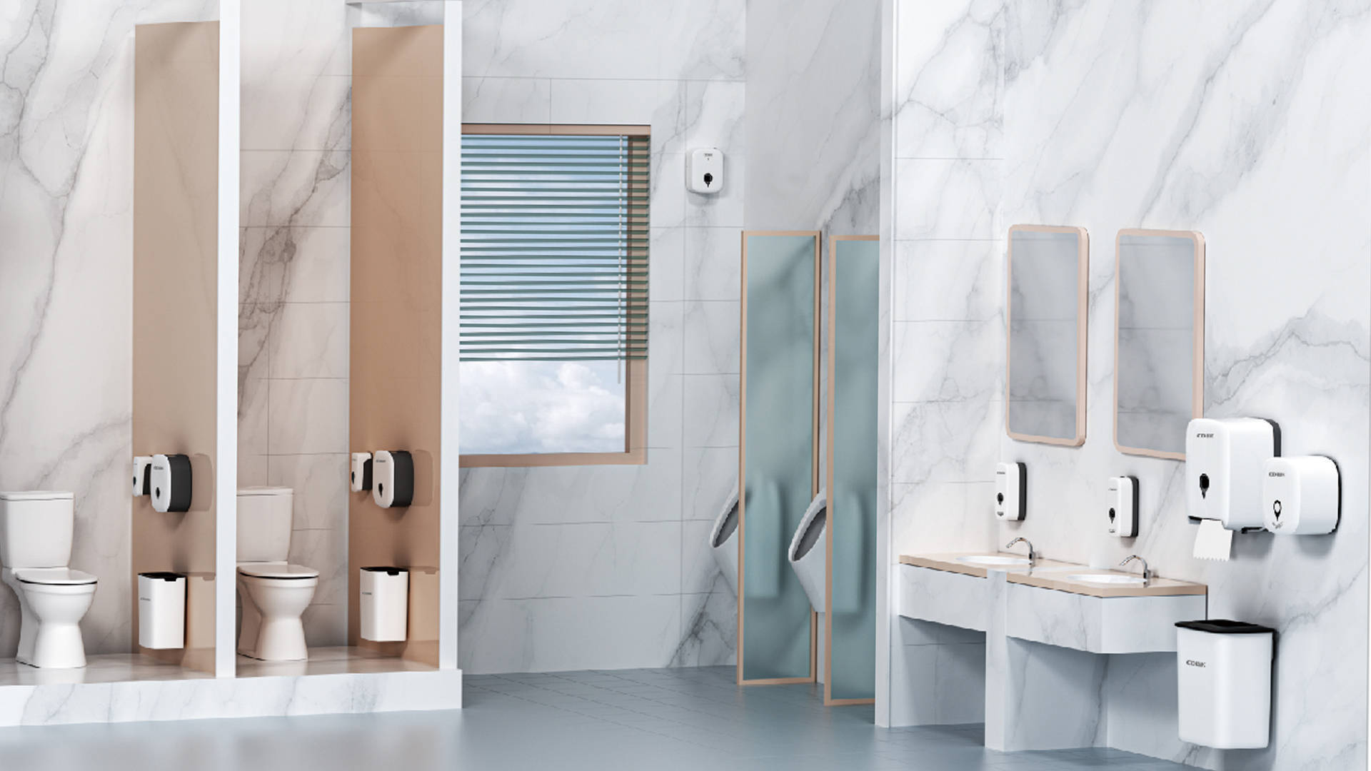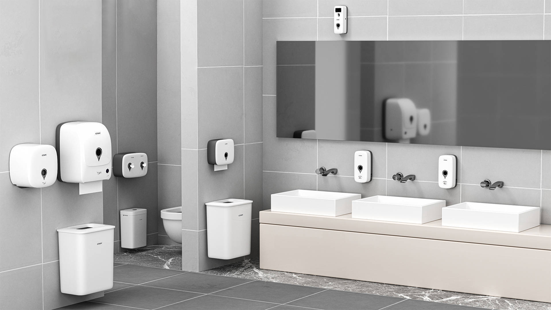 公共衛(wèi)生間包括高速干手機(jī)、水劑噴香機(jī)、擦手紙巾盒、感應(yīng)皂液器、智能魔鏡、感應(yīng)水龍頭、公共垃圾桶等系列化產(chǎn)品,產(chǎn)品套裝具有現(xiàn)代感的無(wú)縫功能性設(shè)計(jì),尤其適用于高端洗手間環(huán)境,既展現(xiàn)高端形象又便于清潔,是公共場(chǎng)所洗手間設(shè)備的品質(zhì)之選。