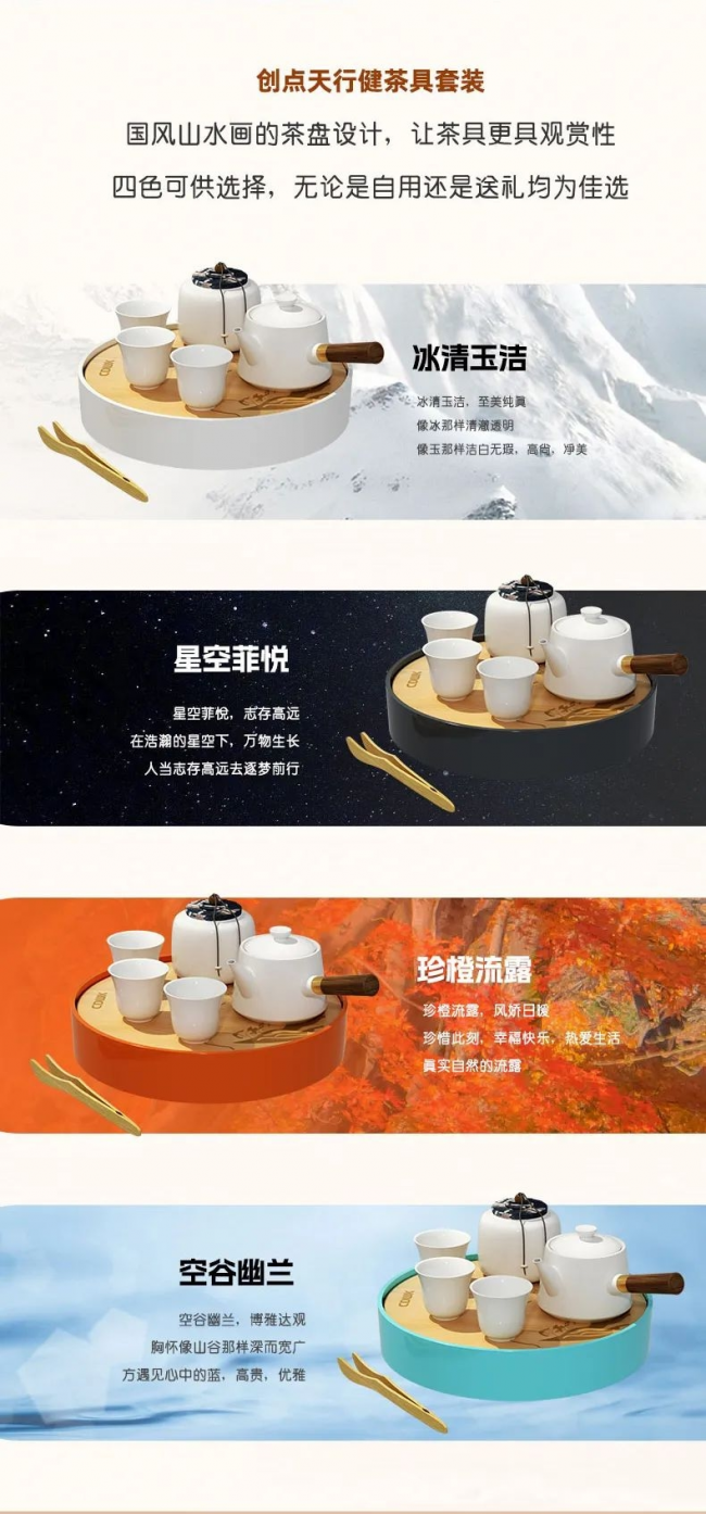 此外,CDWK創(chuàng)點(diǎn)茶具還推出國(guó)風(fēng)山水畫的茶盤設(shè)計(jì),讓茶具更具觀賞性,冰清玉潔、星空菲悅、珍橙流露、空谷幽蘭等四色可供選擇,無(wú)論是自用還是迭禮均為佳選。