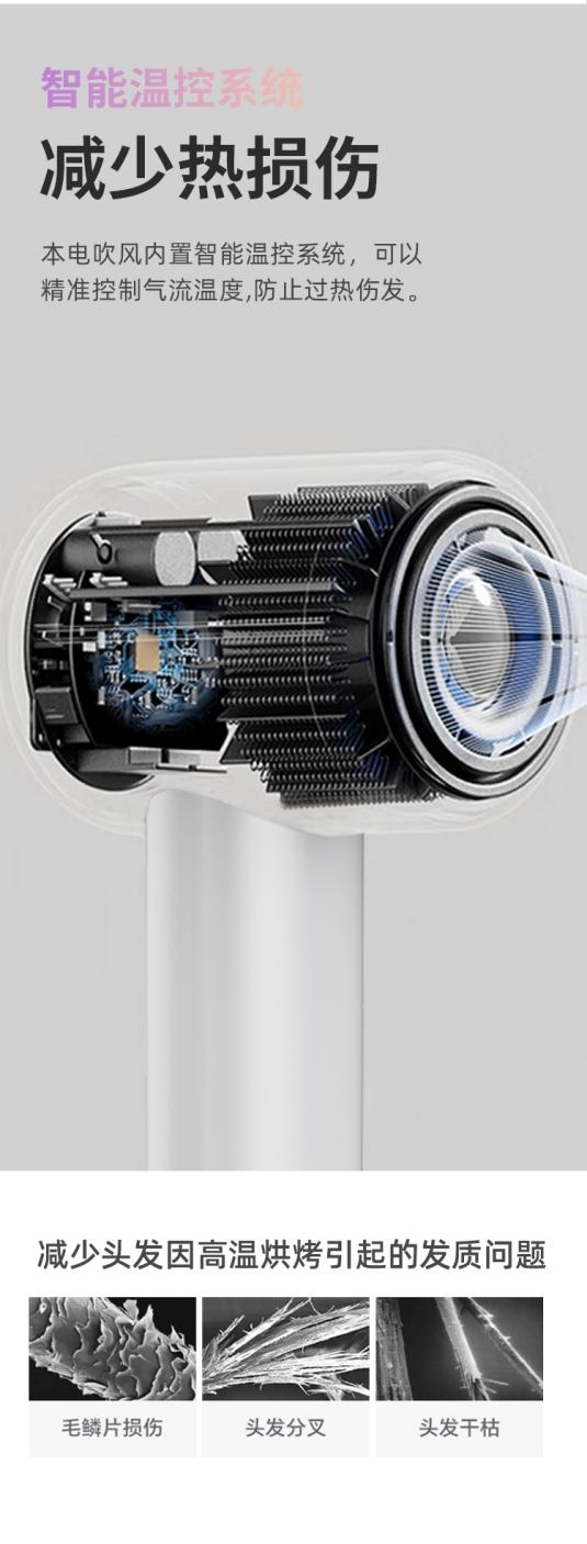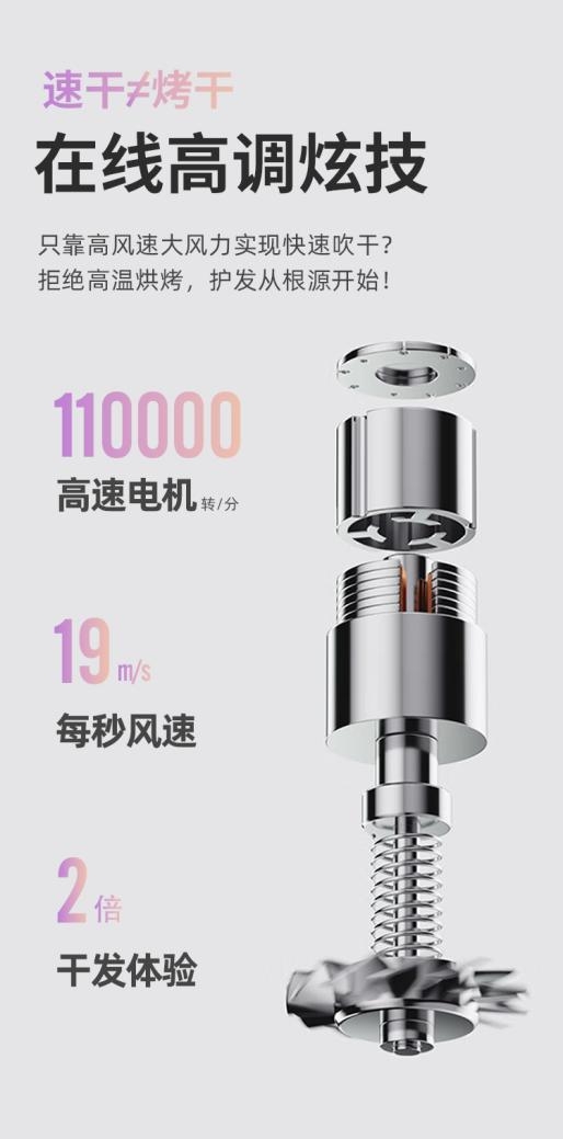 同時,高速吹風機通過電子芯片的智能控制,可以實現(xiàn)精細的風速調節(jié),每分鐘能輸出 19m/s 以上的大風量,快速將頭發(fā)吹干,縮短使用時間,1分鐘即可吹干利落短發(fā),長發(fā)也僅需5分鐘,高效速干。