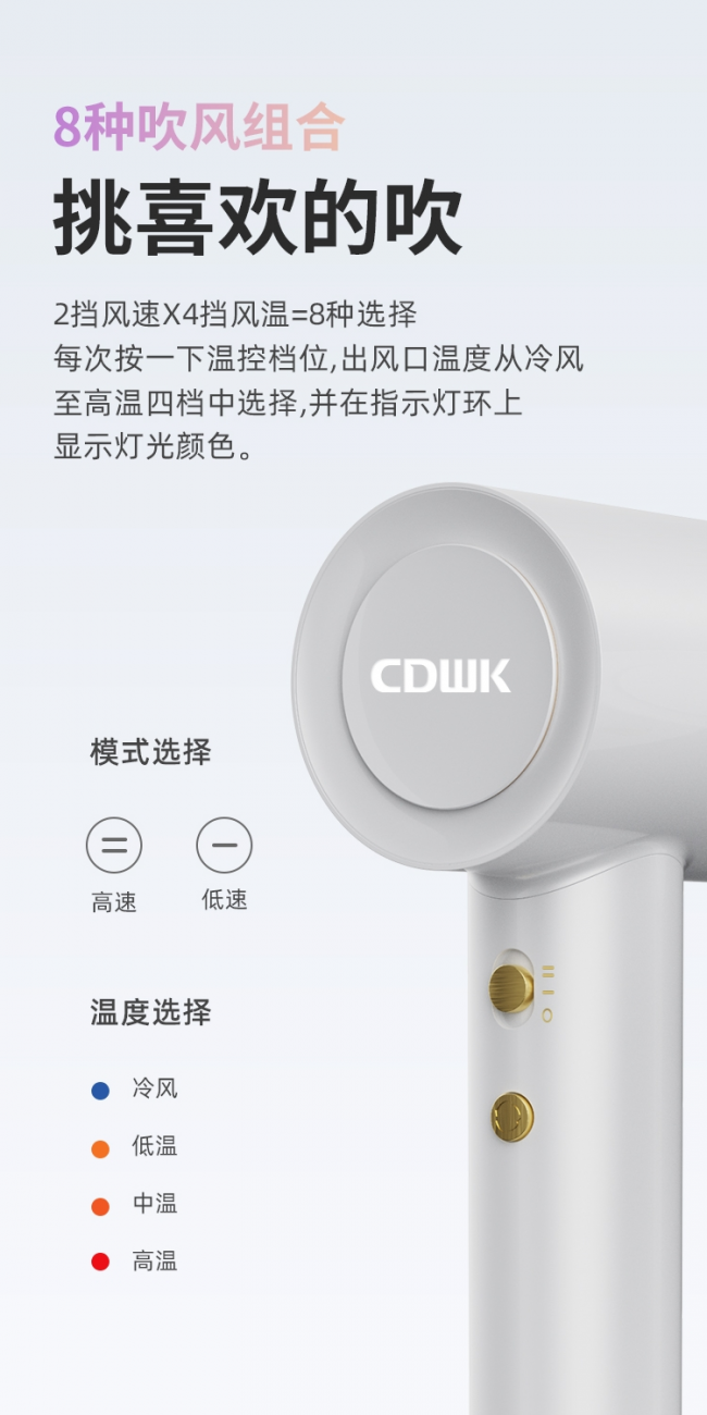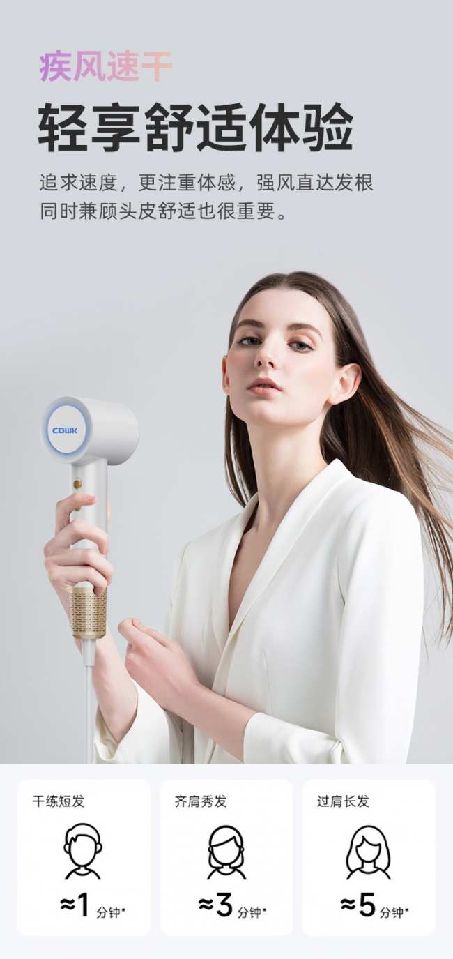 CDWK創(chuàng)點近期推出的新生代高速吹風機,配備強勁的風力,高效將水分從頭發(fā)中吹干,使人們從此告別繁瑣低效的吹頭發(fā)環(huán)節(jié)。
