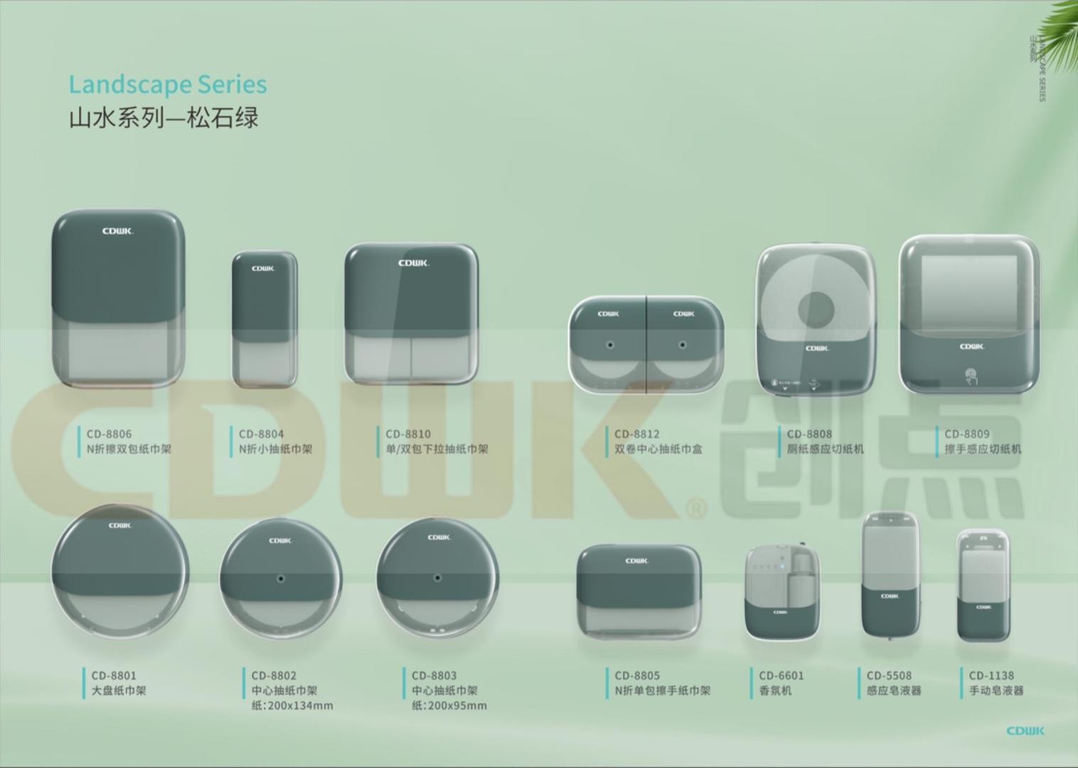 山水系列主打環(huán)保理念,崇尚清雅、純凈和自然的設(shè)計(jì)美學(xué),以材質(zhì)與肌理抒敘美感,達(dá)到“以意構(gòu)境、以意造型、以意生色”天人合一的狀態(tài)。目前,該系列有鉆石白和松石綠兩種顏色,包括了大盤(pán)紙巾盒、雙卷紙巾盒、擦手紙巾盒、皂液器、感應(yīng)切紙機(jī)、智能香氛機(jī)等產(chǎn)品。設(shè)計(jì)上以人為本,選擇極簡(jiǎn)、留白的設(shè)計(jì)語(yǔ)言,使用更少的元素,采用雙色拼接,以新潮極簡(jiǎn)的設(shè)計(jì)美學(xué)傳遞美好生活方式,同時(shí)使得產(chǎn)品呈現(xiàn)出細(xì)膩光滑的質(zhì)感,擁有流暢的線條,極盡演繹簡(jiǎn)約輕盈的美學(xué)造詣,塑造沉穩(wěn)亦靈動(dòng)的空間氣質(zhì)。